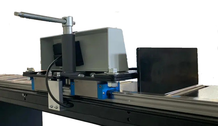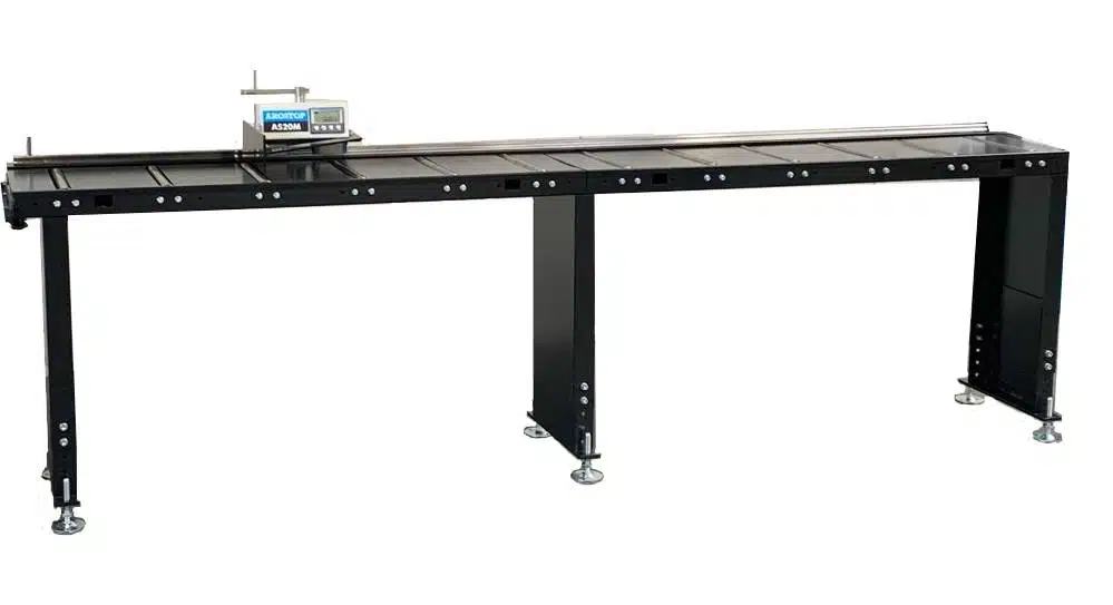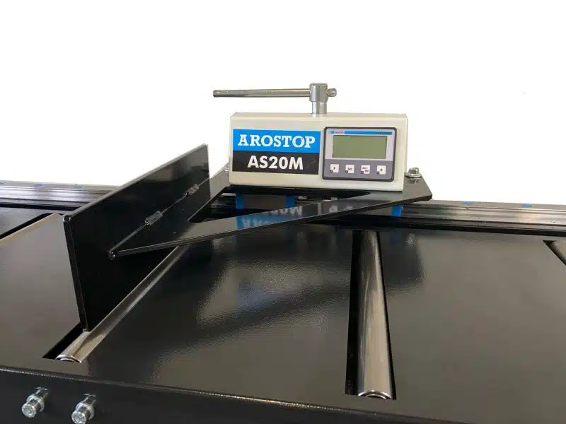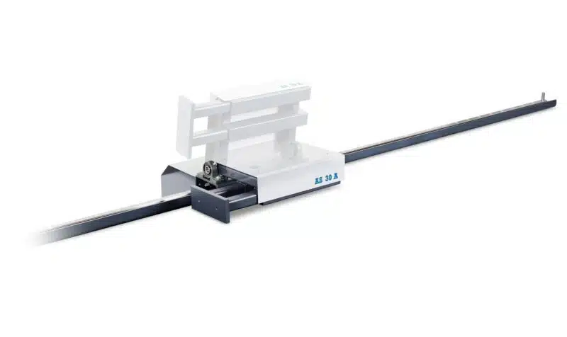 AROSTOP, digital length measuring system model AS 20M, is a manually movable length measuring system with a simple and easy-to-read digital display in the stop carriage, mounted on a 30 mm linear guide mounted on a steel angle bracket. The system can be used on both the left and right sides of the machine, and the counter direction can be adjusted to the user’s desired direction.
